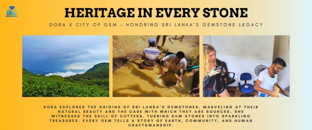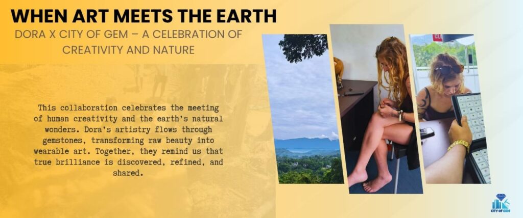 In her collaboration with City of Gem, Dora expressed deep admiration for Sri Lanka’s gemstone heritage. She was amazed by how responsibly sourced and naturally formed the stones were — especially those from Kolonna, Rakwana, Pelmadulla, Kahawatta, Endana, Rambuka, Kalawana, galpaya, Embilipitiya, and Nivithigala villages, where gem mining connects directly with nature and community. She also appreciated seeing the precision of gem cutters, the sparkle born through human touch and skill.
