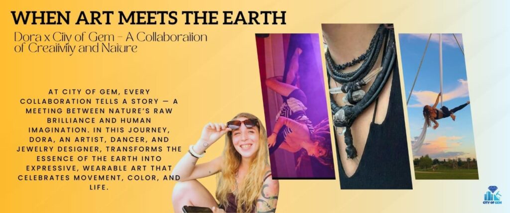 At City of Gem, every collaboration is a story — a meeting point between nature’s brilliance and human creativity. Among those stories, one stands out with extraordinary color and energy: Dora, a multidisciplinary artist, aerial silks dancer, and jewelry designer whose imagination transforms raw elements into wearable art.