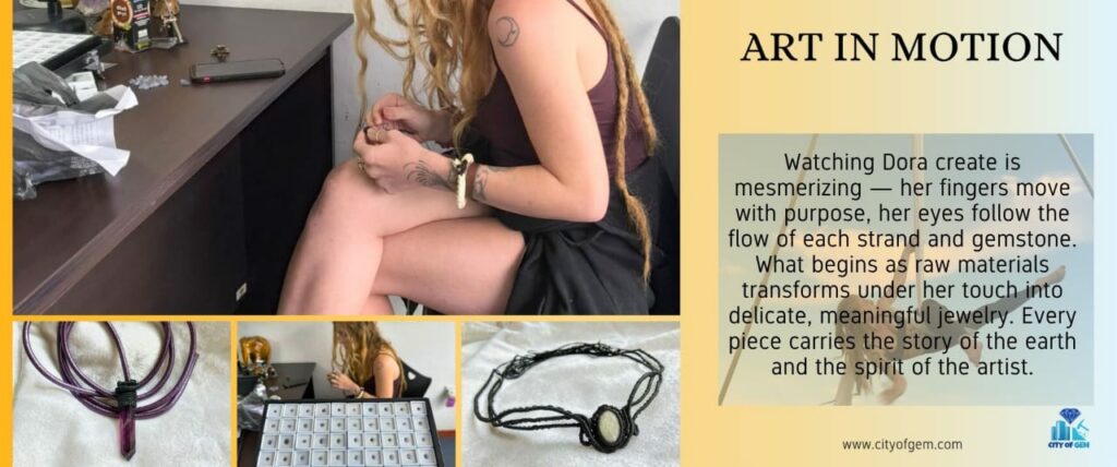During her time at City of Gem, Dora also shared her world of creativity. Sitting in our workspace, she began weaving a delicate piece of macrame jewelry right there — using rope, wire, and intuition. The focus on her face, the flow of her fingers, and the energy around her transformed the space into a living art studio. It was mesmerizing to see an artist in full harmony with her craft — creating beauty directly beside trays of faceted sapphires and raw crystals from the earth.