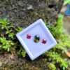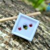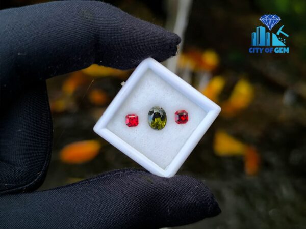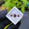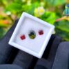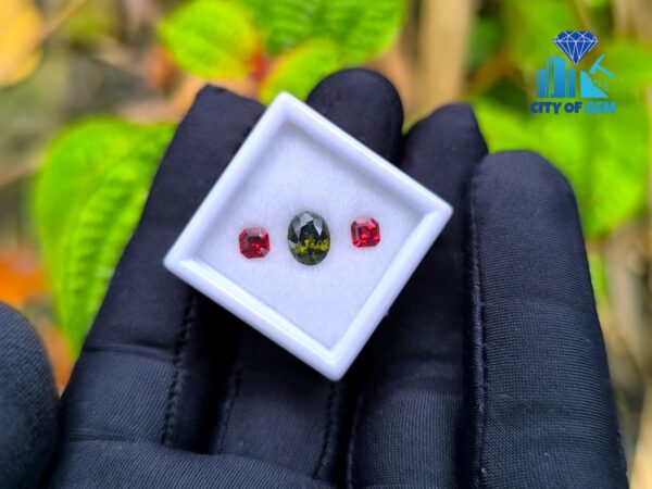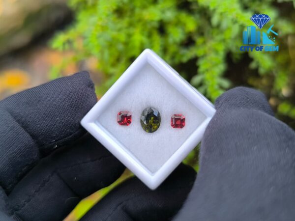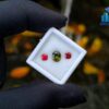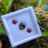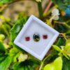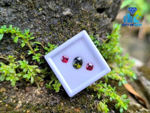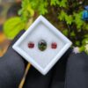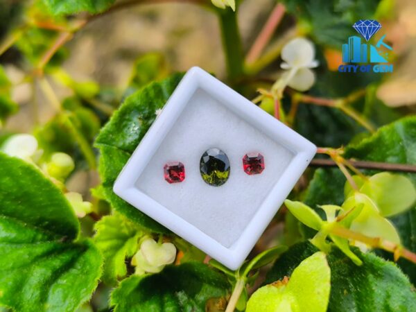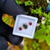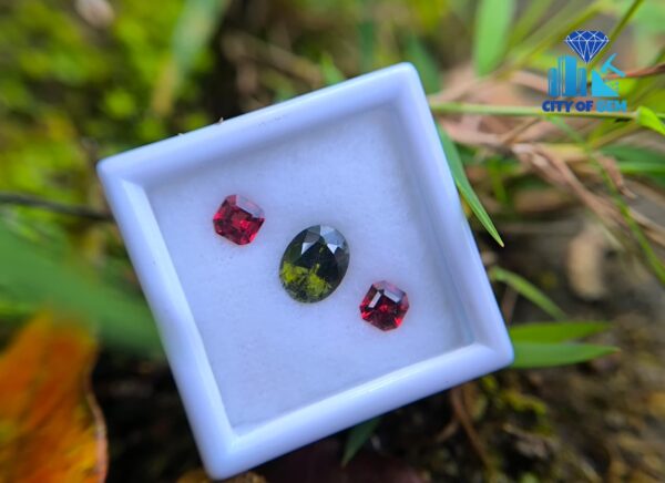 Alongside it, a red garnet cut in an octagonal form introduces warmth and contrast. The fairy-red tone adds a delicate intensity that frames the green center beautifully, creating visual balance without overpowering the design. This pairing reflects a thoughtful harmony—cool depth meeting gentle warmth—making it ideal for custom rings, earrings, or symbolic jewellery pieces.