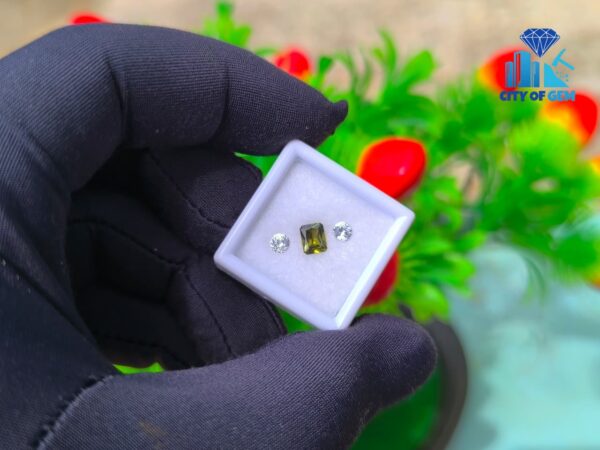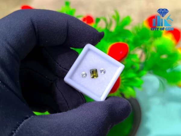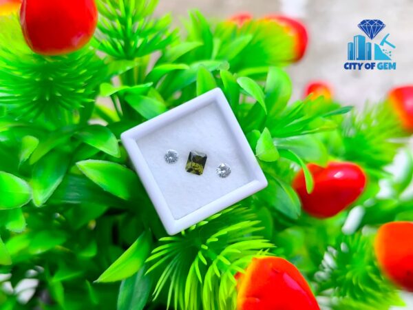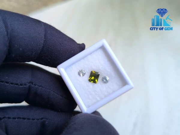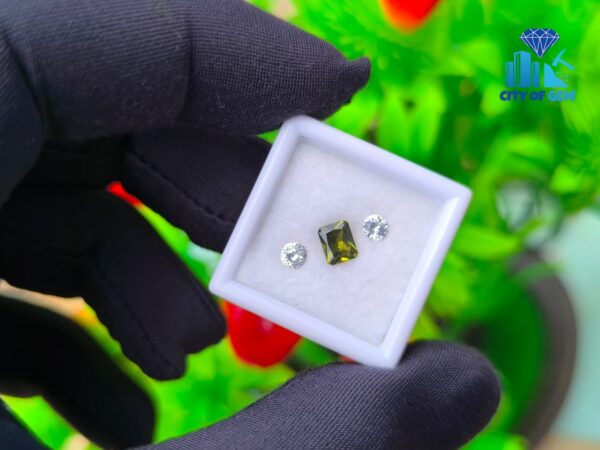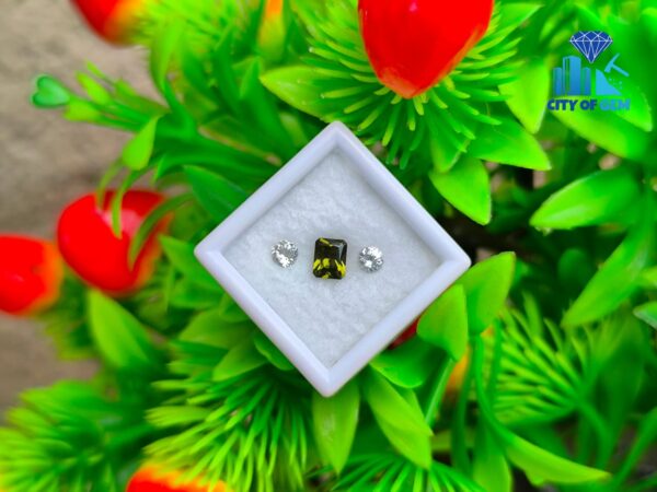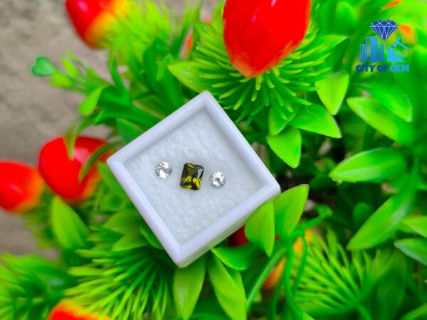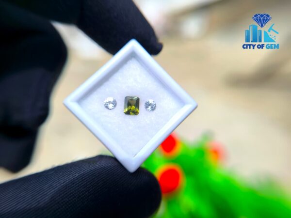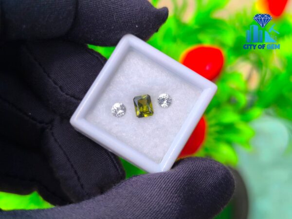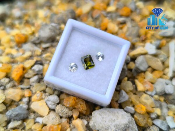 Supporting the zircon is a matching pair of white sapphires. Cut in classic round form, they offer brightness and structure, enhancing the depth of the green center without overpowering it. Their clean appearance creates contrast while maintaining harmony, making the trio well suited for elegant rings, fine pendants, or bespoke jewelry concepts.