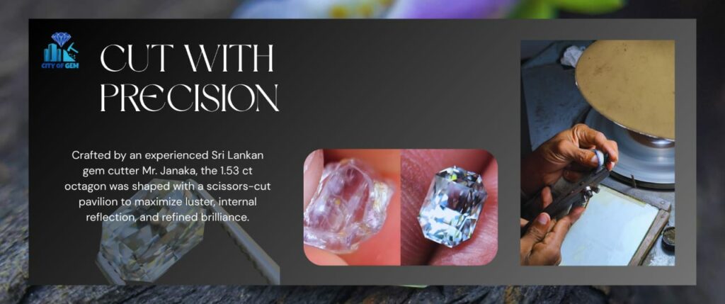 The cutting process was entrusted to Mr. Janaka, an experienced Sri Lankan gem cutter known for precision and restraint. After careful planning, the stone was cut into a beautifully proportioned 1.53 carat octagon shape with a scissors-cut pavilion. This cutting style was chosen specifically to enhance luster, balance, and internal reflection—allowing the natural white sapphire to display a clean, elegant sparkle.