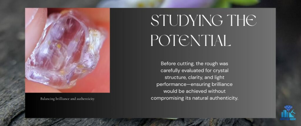 Rather than rushing the process, the stone was carefully studied. Its crystal structure, natural shape, and clean internal areas showed strong potential for a refined cut with excellent light return. Respect for the material was essential. A decision was made to transform this rough into a faceted gemstone that would emphasize brilliance without sacrificing authenticity.